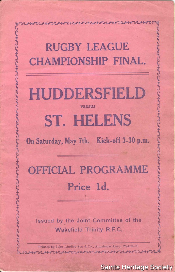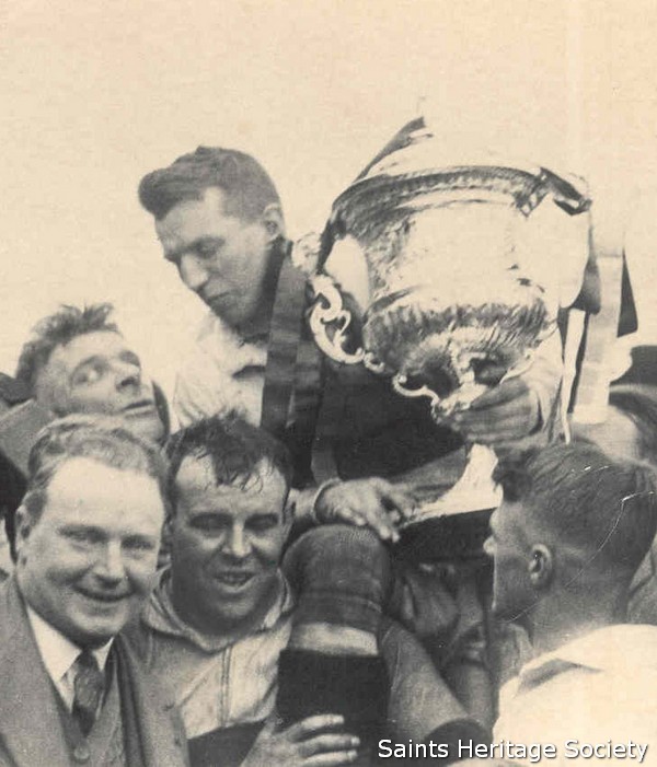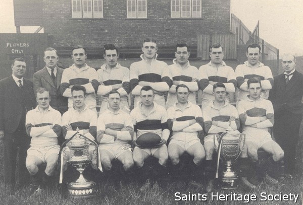 ![]() 1932 Double winners Just before half time, Winnard found touch near the Huddersfield line and scrum-half Thompson was penalised for feeding. Lewis piloted the ball over the bar to give the Saints a seven-point lead. Soon after the second half began, full-back Bowkett registered Huddersfield's first points with a dropped penalty goal, but Lewis replied with another well-taken penalty after scrum-half Garvey had been obstructed following a kick ahead. The St. Helens defence seemed to be coping admirably until Jones and Lewis let a high ball bounce between them and Walker rushed in to score for the Yorkshiremen. Bowkett missed the conversion and there was no further scoring in the match. George Lewis was presented with the trophy by Mr. J.Wood, the Secretary of the Rugby League, but a problem ensued! George could hardly be seen by the triumphant Saints' supporters. Huge second-rower Jack Arkwright soon put matters right. He took hold of his captain and with one solid heave put him and the cup safely on his broad shoulders. | ||||||||||||||||||||||||||||||||||||||||||||||||||||||||||||||||||||||||||||||||||||||||||||||||||||||||||||||||