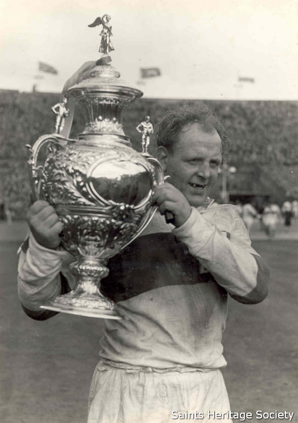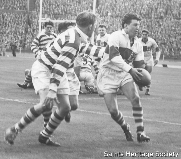 ![]() Alan Prescott with the cup The game itself was a real arm-wrestle, with both sets of forwards vying for superiority and the ball rarely reaching either team's threequarters - a real bash and batter affair. It almost seemed as though both teams were scared of throwing the ball about, when Saints' skipper Alan Prescott made a scything run through the Halifax defence, just after the hour mark. Although his final pass went to ground and there was no score, it gave Saints the confidence to throw the ball about and have a go. A minute later, winger Frank Carlton got on the end of a magnificent move and touched down for what was to be the game-breaking score. Full-back Austin Rhodes kicked the goal to make it 5-0. In the 70th minute, Saints' Welsh winger Steve Llewellyn scored another brilliant try, converted by Rhodes and although Halifax full-back Griffiths replied with a penalty goal [10-2], the game was sealed with a last-minute try from skipper Alan Prescott, who won the Lance Todd trophy as Man of the Match. The Saints' team returned to over 20,000 ecstatic fans packed into the Town Hall Square, where the Challenge Cup was displayed to the supporters for the first time. | ||||||||||||||||||||||||||||||||||||||||||||||||||||||||||||||||||||||||||||||||||||||||||||||||||||||||||||||||