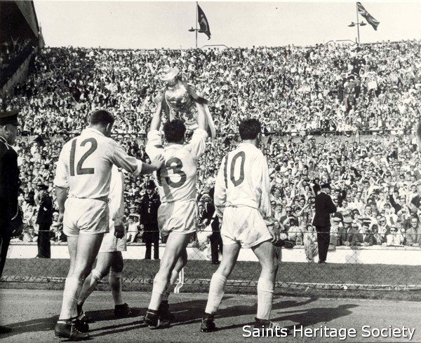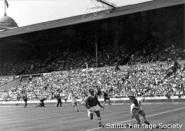 ![]() Alex Murphy scores It proved to be a fantastic game for the fans, very fast and open on the lush Wembley turf, but Saints had the upper hand with the sheer power of their back three forwards, Don Vines and Dick Huddart in the second row and skipper Vince Karalius at loose forward. It was Huddart who set Alex Murphy up for the first try in the 32nd minute, which gave Saints a crucial lead after Griffiths had booted over an early penalty for the Riversiders. An Austin Rhodes penalty made it 5-2 at half-time for St. Helens, who returned to the dressing rooms for a special drink of lemonade, water and salt! Griffiths kicked another shortly after the interval to reduce the deficit to one point and then the defining moment came, in the 63rd minute. After a Wigan attack broke down in the Saints' quarter, winger Tom van Vollenhoven picked up and set off on a scorching 30 yard run. Seeing several defenders in front of him, he passed inside to his centre, Ken Large, who took the move on and gave Vollenhoven a perfectly-timed return pass to enable him to surge between the posts for a brilliant try. Full-back Austin Rhodes added the conversion and another penalty later as did Griffiths for Wigan a minute before the final whistle, but at 12-6, the Challenge Cup headed for Knowsley Road. Wigan had several chances to score during the match, but it just wasn't their day! | ||||||||||||||||||||||||||||||||||||||||||||||||||||||||||||||||||||||||||||||||||||||||||||||||||||||||||||||||
