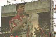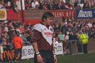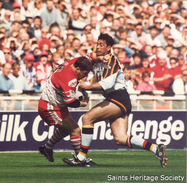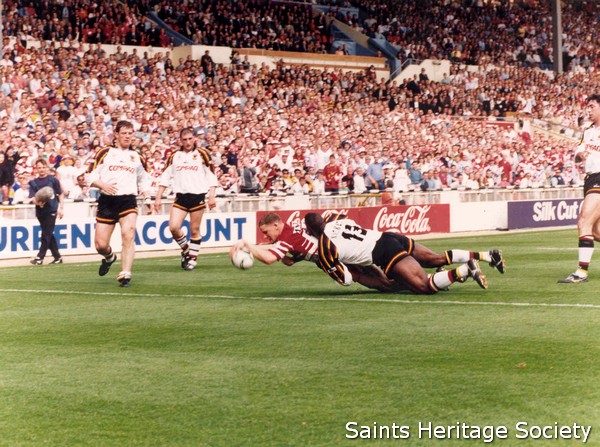 ![]() Back with the cup The Saints got off to a real flyer, with full-back Steve Prescott scoring twice in the first 15 minutes. Yet by half-time, they had lost impetus, with the Bulls enjoying a 12-14 advantage. Things got progressively worse for St. Helens, to such an extent that by the 53rd minute, Bradford scrum-half and captain Robbie Paul had scored two tries, Bernard Dwyer another and defeat was very much on the agenda at 12-26. It was time for desperate measures and within the space of ten minutes the Saints had snatched back the lead in the most incredible circumstances. Three towering bombs from scrum-half Bobbie Goulding wrought havoc in the Bradford defence, with Bulls' full-back Nathan Graham struggling to get anywhere near the ball. Keiron Cunningham, Simon Booth and Ian Pickavance were the try-scorers. Goulding converted all three and the Saints restored their lead at 30-26, an unlikely scenario at one stage. It was back to handling after that, with Danny Arnold streaking in for his second try. Yet there was more drama with ten minutes to go, when Robbie Paul scored his third touchdown. Cook's conversion reduced the lead to two points and it was left to Apollo Perelini to make the game safe for the Saints with a marvellous effort with just five minutes to go to complete one of the greatest come-backs ever in a major final. | ||||||||||||||||||||||||||||||||||||||||||||||||||||||||||||||||||||||||||||||||||||||||||||||||||||||||||||||||||||||||||||||||||||||||||||