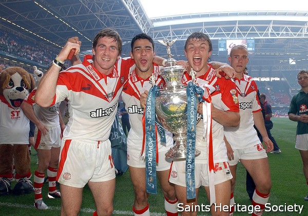 ![]() Edmo Gardner and Wilkin It was the Saints who scored first, in front of over 73,000, when Australian stand-off Jason Hooper disrupted a last-tackle Wigan kick. Lee Gilmour picked up the loose ball and fed centre Willie Talau, who gleefully dived over the line. Sean Long converted brilliantly from the touchline. After an extended spell of Wigan pressure, however, hooker Terry Newton got on the end of a grubber to kick to register his side's first try, converted by Farrell. Wigan had a try disallowed by the Video Referee shortly afterwards. This was a real turning point in the game, as Sean Long gave Saints the lead with a penalty and grubbered into the in-goal area shortly afterwards for Willie Talau to claim his second try for a 14-6 advantage. Adrian Lam put winger Brett Dallas in at the corner as Wigan hit back to within four points. Then came another piece of magic just on half-time, as a flowing attacking move saw full-back Paul Wellens squeeze in by the posts. Long's conversion made it 20-10 and Saints had increased their chances of cup glory significantly. After the break, Wigan were forced to play catch-up football and made several handling errors. On 50 minutes, Paul Sculthorpe powered his way over and Long added the conversion and a further penalty goal. Although Dallas scored for Wigan, the final try three minutes later by Willie Talau, following a brilliant kick and re-gather from Lance Todd trophy winner Sean Long, brought home the spoils. | ||||||||||||||||||||||||||||||||||||||||||||||||||||||||||||||||||||||||||||||||||||||||||||||||||||||||||||||||||||||||||||||||||||||||||||